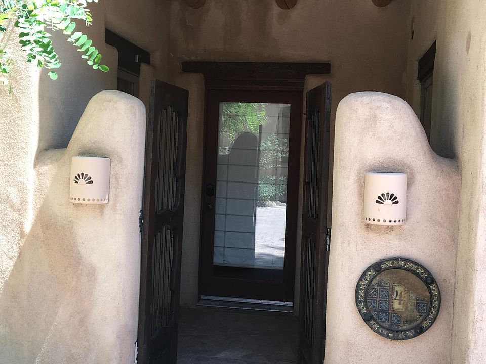Gorgeous, highly detailed, true adobe, upscale condo in the heart of the Town of Taos! Walk to everything! Hospital close. Plaster walls, 2 kiva fireplaces, flagstone courtyard, hand carved corbels, hand painted doors, viga ceilings in each room, original Taos trees surround you. Kitchen has gast range, beautiful terra cotta colored granite countertops, french door refrig, wine refrig. 2 large bedrooms, two walk-in closets, 2 large walk-in showers. Master has a jacuzzi tub. Upstairs off master is huge rooftop deck with kiva fireplace, built-in banquette, covered portal and a 4 person hot tub! Upstairs on landing is space for a pocket office. HOA handles trash removal and snow removal. Tenant to pay all utilities. We are an entirely smoke-free property. This includes all types of smoking products. Thank you for your understanding.