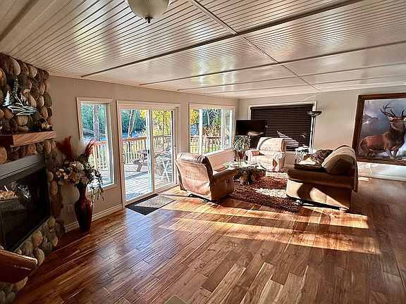 Stone gas fireplaceKlickitat riverfront homeLarge family roomPrivate back deckStainless appliancesGranite countertopsFire pit