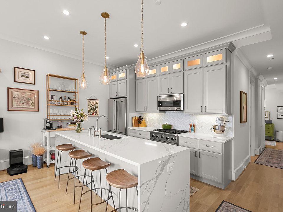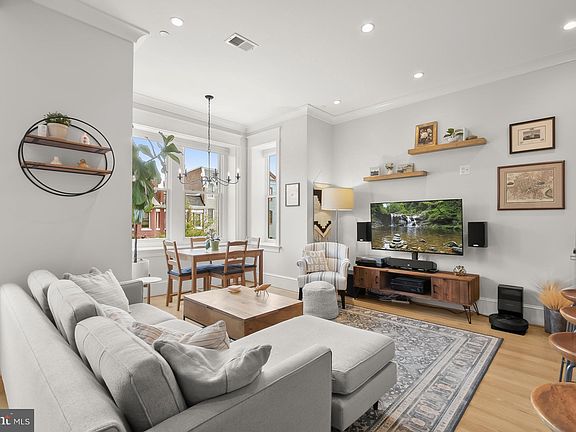 **Seller will credit Buyer $2000 at settlement to cover a year of Garage Parking a 1-2 block walk from Apt #3** Welcome to residence #3 at 408 M St NW - A spacious 2 BEDROOM PLUS DEN & 2 BATH condo, where upscale finishes meet smart design in a boutique 4-unit building. From the moment you walk in, you’re greeted by tall ceilings, wide plank hardwood floors, custom crown molding, and ambient recessed lighting. The beautifully appointed chef’s kitchen is the heart of the home, outfitted with quartz countertops, a striking waterfall island with stool seating for 4, Viking stainless steel appliances, and soft-close cabinetry. There is a seamless flow between the kitchen and living/dining spaces, complemented with beautiful outlooks from the massive bay window to the historic buildings of M Street in your front yard. Down the hall you’ll find a guest bedroom with 2 closets, hall bathroom with spa-inspired tilework and designer finishes, and an open den/nursery/office space connected to full size in-unit washer & dryer closet. The primary bedroom at the back of the home is outfitted with a recessed ceiling, two closets, and large marbled primary bathroom with double sink vanity. Multiple smart storage cabinets and closets have been custom created throughout the home to make the most of every square foot. Perfectly positioned in the heart of DC, this address is just blocks from Blagden Alley, CityCenterDC & Safeway. Take part in the amazing culinary scene with many acclaimed restaurants and coffee shops nearby including Kinship, Metier, Causa Amazonia, The Dabney, Unconventional Diner, La Colombe, Seymour, and the list goes on. With easy access to multiple Metro stations, I-395, and I-695, getting around is effortless—whether you're commuting, exploring, or escaping for the weekend. Turnkey, thoughtfully designed, and unmistakably stylish—this one is ready to impress.