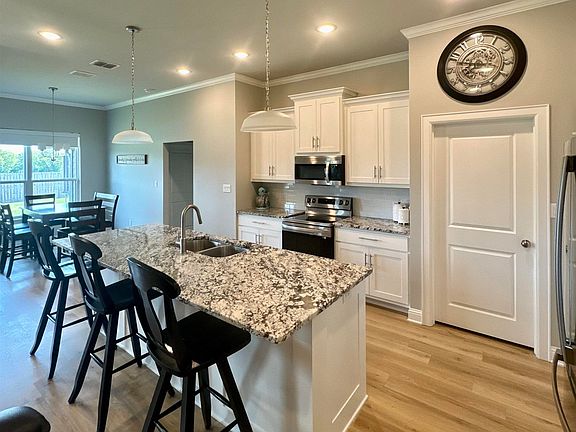 Built in 2022, this beautifully maintained home offers a thoughtful layout and an array of desirable features. The spacious open-concept design seamlessly connects the kitchen, living, and dining areas—perfect for both daily living and entertaining. The primary suite is generously sized and includes a luxurious bathroom with a soaking tub, walk-in shower, and ample storage space. The kitchen is a standout, featuring granite countertops, a large island with seating, stainless steel appliances, custom cabinetry, a pantry, and stylish lighting and hardware. Durable vinyl plank flooring runs throughout the main areas, adding both elegance and practicality. Step outside to enjoy a covered patio, professionally landscaped yard, full gutter system, uplighting, and an irrigation system. The home is also equipped with an alarm system for added peace of mind.  Energy efficiency is a highlight, with double-pane windows, a high-efficiency AC unit, programmable thermostat, and custom blinds—all helping you save on utility costs. Located in a quiet, family-friendly neighborhood near schools, this home truly has it all—comfort, style, and convenience. It’s been lovingly cared for and is ready for new owners to enjoy!Refrigerator not included in sale.