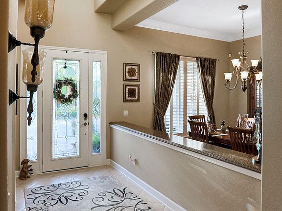 Inside, you'll find volume ceilings with 2-piece crown molding, upgraded plantation shutters, and designer lighting throughout. The formal living room—currently used as an office—features French doors for privacy, while the formal dining room easily accommodates a large table and hutch for entertaining.