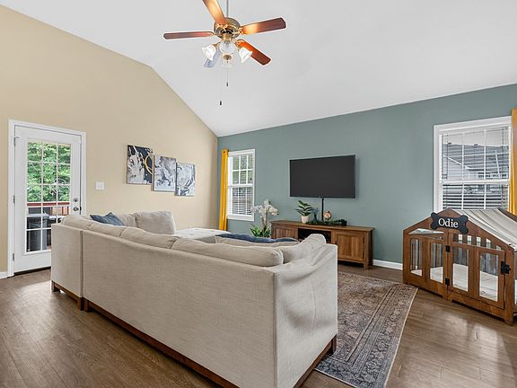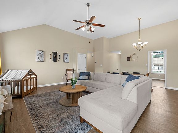 Unique floor plan with some beautiful finishes and feature walls. Cozy rocking chair front porch, Large kitchen with custom backsplash, pantry and plenty of cabinet space with vaulted ceilings. Great living room / dining room combination for gatherings and entertaining. Large walk in shower in the primary suite with double vanities. Covered deck overlooks the flat backyard with privacy fence.