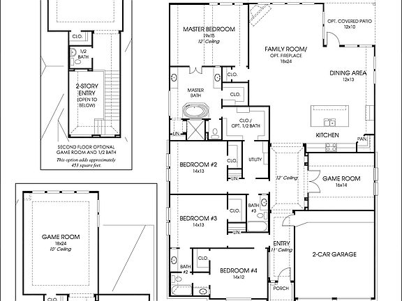 Entry and extended entry with 11-foot ceiling. Game room with French doors. Kitchen features an island with built-in seating space and a walk-in pantry. Family room and dining area open to kitchen, both with walls of windows. Private master suite. Master bath with double door entry includes garden tub, separate glass-enclosed shower, dual vanity sink, two spacious walk-in closets. Two-car garage.
