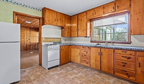 This well maintained home is ready for it's next owner. Large living room has 2 large windows to let lots of light in & a electric fireplace. The kitchen & formal dining room can be entered from the living room. The laundry room of kitchen has access to large backyard & garage. The dutch door between the kitchen & formal dining makes for easy flow between the 2 rooms. The large dining room has built-in shelves & pantry closet on one wall. Door from dining room leads to the large sunroom that overlooks the backyard. The storage shed in the backyard is staying. Bathroom is between the 2 generously sized bedrooms both with hardwood floors. This home will not last long. Check it out today & be in your new home before Christmas!