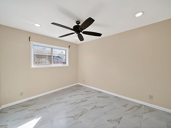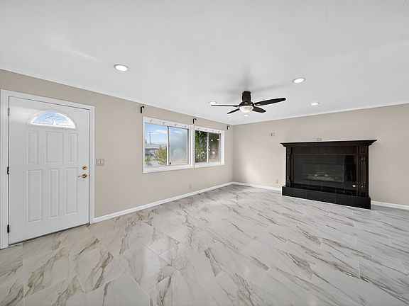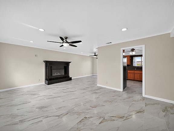 Step inside to discover a spacious, light-filled interior featuring glossy marble-patterned tile flooring, recessed lighting, and modern ceiling fans throughout. The open-concept living area is anchored by a sleek black fireplace and flows seamlessly into the dining space and kitchen perfect for entertaining or relaxing at home.