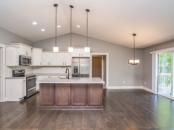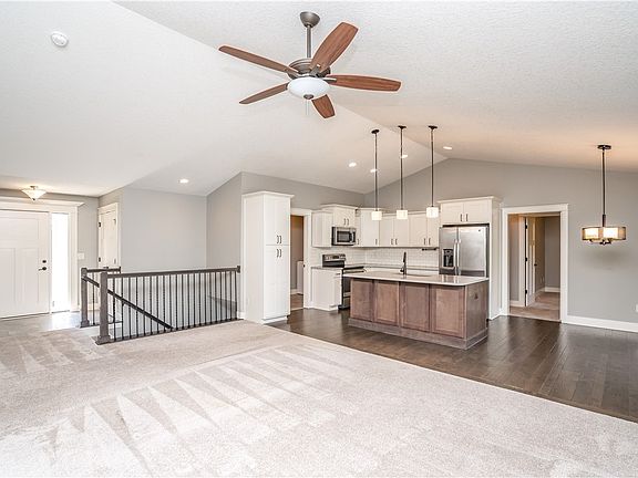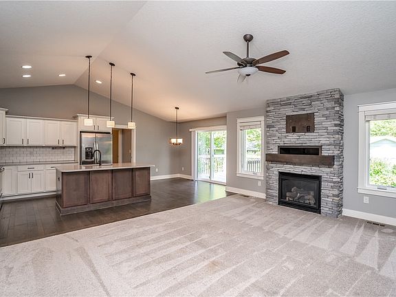 With over 2,700 sq ft of living space, you've got everything you need in this home! Enjoy the openness of the home with vaulted ceilings and a gorgeous floor to ceiling stone fireplace. The kitchen features quartz countertops, tiled backsplash, and white cabinets. The island gives a lot more workspace, storage, and additional seating. The finishes are modern and really tie in the look and feel of the home. Enjoy added privacy of the primary suite with tray ceilings, a primary bath with dual vanities, tiled shower with two shower heads, jacuzzi tub, and large walk-in closet. The additional two bedrooms are on the other side of the main floor and are spacious and share a Jack-N-Jill bathroom. Enjoy additional finished square footage in the basement boasting a family room with a wet bar, full bath, and 4th bedroom. This home is move-in ready, and ready to be yours!