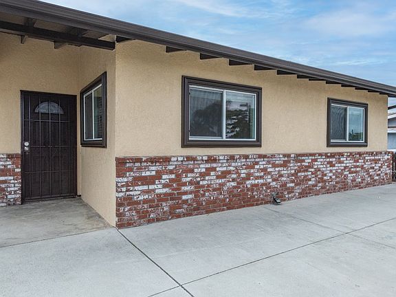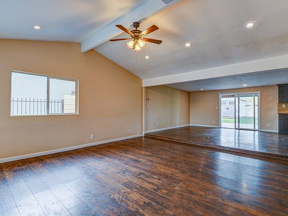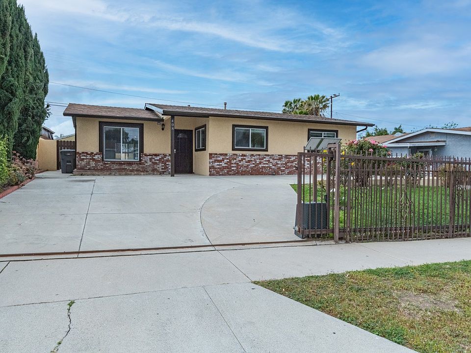 Residing on a charming cul-de-sac in Carson is a delightful single-story home! A gated front yard adorned with modest greenery and an expansive driveway frame the brick face entrance before opening into this 1,627-sqft home. With high slopped ceilings elevating the spaciousness of the living room, destressed wood styled laminate flooring throughout the open floorplan of the adjoining dining room and kitchen creates a flowing entertainment space. Recessed lights in the vibrant kitchen highlight the glossy granite countertops with complimenting backsplash, rich mocha cabinetry, and pristine stainless-steel appliances. By contrast to the common areas, each bedroom features plush carpet floors. The main bedrooms enjoy high slopped ceilings, center ceiling fan with light fixture, and large closets with mirrored sliding doors. In the primary bedroom, find a highly spacious room complete with a large walk-in closet and an attached private bathroom. The home even includes a convenient laundry room. Accessible through a set of sliding glass doors in the dining room, venture outside to delight in the enormity of the covered back patio and expansive grassy lawn with a prominent tree, providing a clear space that's ideal for any private backyard oasis.