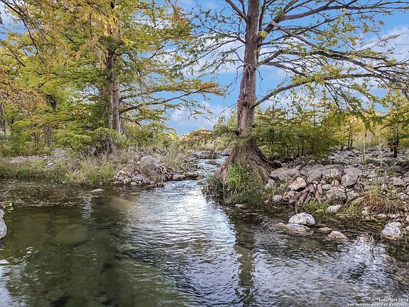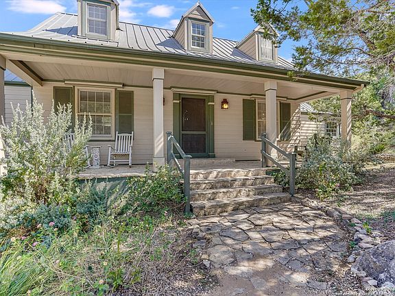 Discover quiet serenity along the Blanco River w/this enchanting 1930s home, set on over 3 acres. This 4-bedroom, 3-bathroom main house also has a detached 2-car garage with a 1-bedroom, 1-bathroom apartment, blending the perfect mix of history, charm, and modern amenities. Tucked among majestic oak trees, the property offers privacy & peacefulness, perched above the Blanco River w/ stunning views. The main house boasts hardwood floors throughout and an inviting open floor plan. Enjoy relaxing on the cozy front porch, or step inside to the delightful kitchen, which features a propane range, ample storage, a breakfast bar & a charming breakfast nook. A short hallway leads to two comfortable bedrooms & a shared bathroom. The primary suite serves as a tranquil retreat, complete with a spacious sitting area/home office. The en-suite bathroom includes double vanity, soaking tub, separate shower, & a large walk-in closet for ample storage. The open dining area flows into the expansive living room, which is anchored by a cozy fireplace and framed by large windows that offer picturesque views of the surrounding nature. From the living room, sliding glass doors open to a screened-in porch, ideal for outdoor dining or lounging while enjoying the natural beauty of the property. Upstairs, you'll find a spacious bunkroom with its own bath, as well as a laundry room. Step outside to explore the property's backyard trails, which lead to the riverbank, where fascinating rock formations and a waterfall create a magical natural setting. Beyond the river lies an expansive tract of land, ensuring additional privacy. The detached garage includes two storage areas, and the apartment above features a 1-bedroom, 1-bathroom layout w/kitchenette, making it perfect for guests. The property has a proven track record as a successful short-term rental, the furniture is negotiable. Don't miss the chance to own this serene riverfront retreat.