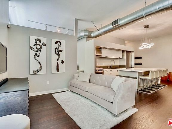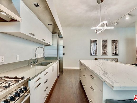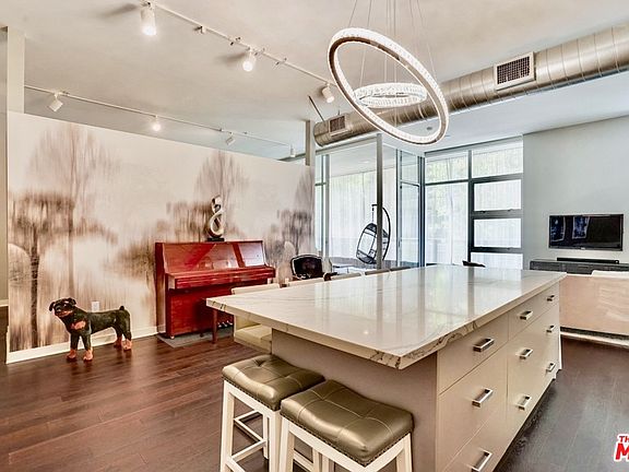 Enjoy sophisticated loft living in the Marina Arts district. Gallery Lofts is a highly sought out community that offers integrated indoor/outdoor living. Floor to ceiling windows and an open concept floor plan provides a sleek modern feel the moment you walk in. 11ft Fleetwood sliding glass doors opens to a large covered patio furnished with privacy curtains. Kitchen features a stunning LED light fixture that hangs above a 9'5" quartz island with storage on both sides--a perfect centerpiece for entertaining and accommodates seating for 9. European stainless steel kitchen appliances and under sink water filter. Hardwood floors throughout unit and automated blinds on all windows. Walk-in master bedroom closet customized with built-ins. Master bath features oversized soaking tub and separate shower. Community is gated and features double-sided fireplace and lounge seating plus two BBQs with outdoor dining area. Owners can purchase meter for EV charging within own private parking space.