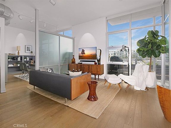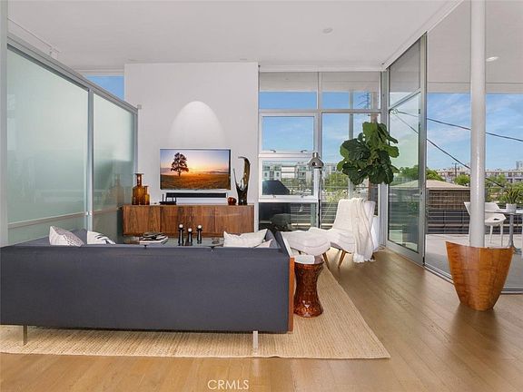 Welcome to the highly desirable Gallery Lofts. This light, bright open concept industrial loft is one of the few south facing units that features city light views. Located in the heart of the Marina Del Rey arts district, this pristine 2 bedroom 2 bath single level unit features nearly 11-foot ceilings with floor to ceiling windows and over-sized Fleetwood sliding doors that let in an abundance of natural light. The stunning custom chef's kitchen features a center island with high-end stainless steel European appliances, including a Liebherr refrigerator, Miele Dishwasher, and Bertazzoni gas range. The unit offers an inviting dining area with an open floor plan, and boasts a large private covered patio perfect for lounging in the sun and enjoying the city view in a seamless indoor/outdoor living space. The primary oversized bedroom offers a custom walk-in closet and en-suite spa-like bathroom with a separate shower and deep soaking tub. The bright second bedroom, which could also be used as an office, connects to a second full bathroom. This unit also includes a laundry room with side-by-side washer and dryer, central air conditioning and heat, floor to ceiling privacy blinds on every window, engineered wood flooring, and only one common wall. Within the gated garage there are two assigned parking spaces and a bonus storage room. The common area has a beautiful courtyard with serene greenery, a seating area, gas fireplace, and two Viking BBQ grills and refrigerators. This is a wonderful location with shops and restaurants within walking distance, close to Abbot Kinney.