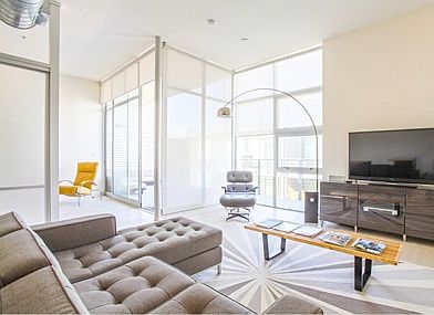 Rare stunning top floor loft in the heart of the Marina del Rey arts district. High ceilings throughout, with floor to ceiling windows and nearly 11 foot Fleetwood sliding doors let in an abundance of natural light. The stylish open living space leads to an expansive patio, creating true California indoor/outdoor living. Open designer kitchen with stainless steel appliances and beautiful finishes. Spacious master bedroom with a partial wall for added privacy and adjacent master bath featuring an oversized soaking tub and separate shower. The second bedroom was enclosed and also has its own bathroom. Quiet location in the complex, gleaming wood floors, laundry closet with washer + dryer, central heating/AC and two parking spaces complete this perfect home. Outdoor lounge area with fireplace, outdoor kitchen and guest parking make it perfect for entertaining. Walking distance to great shops, restaurants, Equinox, Marina Marketplace & close to the beach. This one has it all!