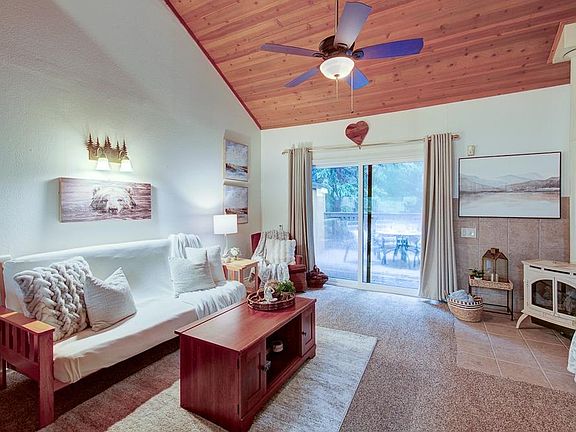 BEST LOCATION in highly sought-after condos in beautiful Shaver Lake - backs right to the creek! Relax on your big deck to the sounds of a babbling brook. Pure tranquility & ultimate privacy w/only peaceful pines behind you. This deck truly extends your living space. Secret is out on Bretz Mill - monthly dues had a huge reduction. For what you'd pay on fire insurance alone on a house, you get fire insurance PLUS all exterior maintenance: roofs, painting, snow & pine needle removal, trash service, pool, hot tub, sauna, & seasonal boat/RV parking. Best deal on the mountain, plus 10 min to the lake & 30 to the slopes! The living room features a cozy propane fireplace & vaulted wood-lined ceiling up to the bedroom w/upgraded tongue-and-groove. Gaze out the newer vinyl slider at the trees. Kitchen opens onto the living room w/freshly painted cabinets, stainless steel fridge, & large breakfast bar, perfect for drinks with friends. Quite a view while you're cooking dinner! A 1st floor half bath means 2 toilets! And if you sleep 2 on the futon, there's only 2 stairs to get inside, so it's a great level-entry option. Head up to the generously sized bedroom, open to below. Feels like a luxury adult treehouse w/room for a king-sized bed, large closet, & private full bath. Sold furnished. All this privacy & still close to the hot tub/sauna for apres ski. Experience true vacation living where you can relax & have the HOA do all the work for you at a great price. Come check it out!