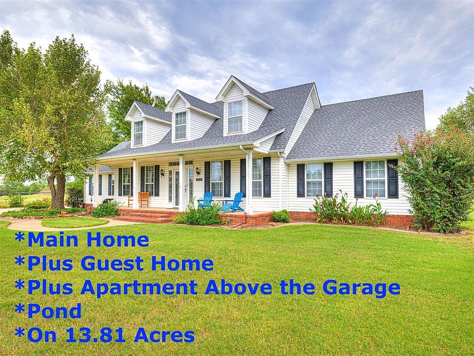Talk about being able to own a personal PARK!!! Not only is the main home stunning with a great view of the pond, there are 2 shops, a stand alone guest house, and a studio apartment located above the detached 2 car garage on 13.81 acres. PLUS, the location just cannot be beat! As soon as you enter the property, you will see and feel the meticulous care. The house is private with over a 1,000 feet of a concrete drive and plenty of extra parking. The main home features a beautifully remodeled kitchen with marble counter tops, new flooring and new appliances. The butler's pantry is dreamy with an additional sink, a beverage cooler and plenty of extra storage. The main living and primary bedroom have been updated with paint and gorgeous wood flooring! The primary bedroom is large and leads to the remodeled, spa-like ensuite bathroom. This bathroom features floor to ceiling tile, double sinks, freestanding bathtub and a frameless shower. On the main level there is also a flex space area that features a double sided fireplace, a secondary dining room that is currently being used as the office, a craft area with the laundry room and a half bathroom. The upstairs has 2 bedrooms with a shared bathroom. The attic access is convenient and leads to plenty of extra storage. The detached garage is connected through a covered walk-way, and contains a walk-in storm shelter. It has a studio apartment (roughly an additional 360 sq ft of living space) on the second level with additional heated and cooled space that could be turned into a bedroom. The separate guest house is great with roughly 672 sq ft of living space! It features a screened in porch, a full kitchen with eat-in space, the shower is zero entry or curb-less, and this house even has its own storage shed.