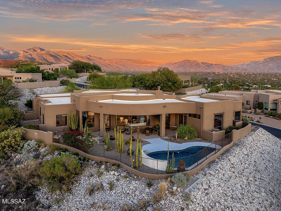 Welcome to your luxury contemporary oasis in the exclusive, gated Sabino Mountain community. The majestic cacti and custom iron door instantly set a dramatic tone. Step inside to an open-concept great room with soaring ceilings and a wall of curved glass that frames breathtaking, panoramic city lights and mountain views. This exquisite home boasts a newly remodeled chef's kitchen featuring custom textured modern slab cabinets, honed quartzite, and premium Wolf/Bosch/Sharp appliance suite, including induction cooking, convection/steam ovens, and a beverage refrigerator. Enjoy soft neutral colors, travertine flooring, designer automatic window treatments, and a cozy fireplace. Utmost privacy and resort-style entertaining is ensured by the remodeled, heated pool with a new finish and water feature. Newer HVAC units (2024/2019) and an expansive 3 car garage complete this exceptional residence.