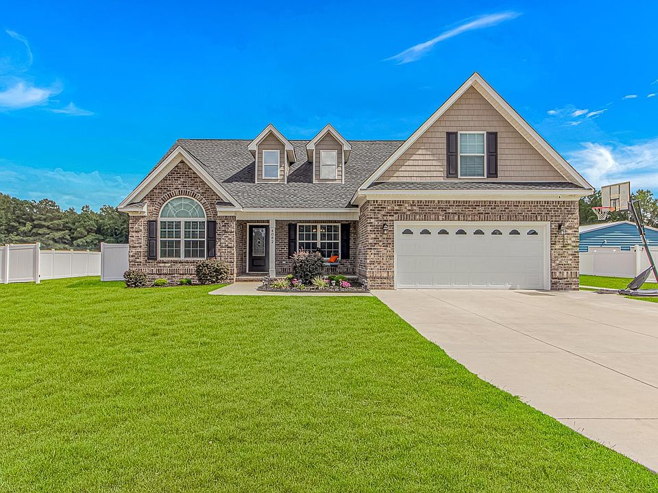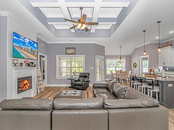 Welcome to your dream home in the heart of Aynor! This stunning property offers the perfect blend of modern elegance and country charm, featuring 5 spacious bedrooms and 4 full bathrooms with loads of custom features throughout. Nestled on 1.91 acres, the property includes a fenced rear yard for extreme privacy and a pond perfect for fishing and canoeing. Walk inside and see the inviting open concept formal dining room, spacious living room, gourmet kitchen. Each living section is detailed with statement-making coffered tray ceiling detail, crown moldings, and LVP flooring. The gourmet open-concept kitchen boasts granite countertops, stainless steel appliances, and a bright breakfast nook, flowing seamlessly into the living areas. The main level highlights 4 bedrooms and 3 bathrooms, including a large primary suite with massive walk in closet. The master bathroom has double vanities, soaker tub, custom tile shower, and tons of natural light. The secondary bedrooms are all great sizes and have LVP flooring and ceiling fans. The 5th bedroom has been converted into a custom top of the line movie theater! All this just minutes from Downtown Aynor and a short drive to Downtown Conway, offering both a country settling with all the conveniences.