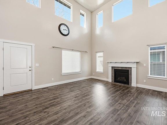 Perfectly located near freeway access, Albertsons Marketplace, the YMCA, Meridian’s shopping, dining hub, and Roaring Springs, this spacious home blends comfort with standout design. The formal living room rises with dramatic two-story ceilings and clerestory windows that fill the space with natural light, centered by a sleek gas fireplace. The open main level features wide-plank LVP flooring and a bright kitchen with granite countertops, stainless appliances, a mosaic backsplash, a large island with bar seating, and easy flow to the dining and living areas, plus backyard. Step outside to a covered patio, fenced yard, shed, and retaining wall. All four bedrooms plus a bonus room sit upstairs, offering flexibility for work, play, or guests. The spacious primary suite offers soft natural light, a large walk-in closet, and an ensuite with dual vanities, a soaking tub, and a separate shower. Built in 2017 and set in the Normandy Subdivision, this home delivers space, style, and everyday convenience in a prime Meridian location.