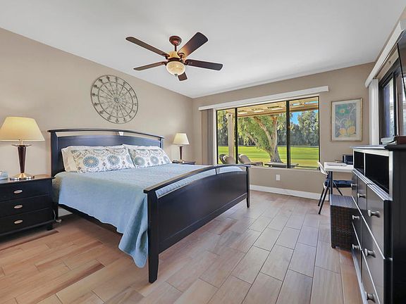 This beautifully updated 2-bedroom, 2-bath condo in the heart of Palm Desert features a redesigned Olympic floor plan with a private 3/4 bath in the second bedroom. An extra wide entry area, enjoy a 2-car garage, covered patio with drop shades overlooking a fairway and lush trees, and soaring volume ceilings and wood-look tile throughout. The modern kitchen has new appliances, the bathrooms have been updated and upgraded. this home is nicely furnished--move-in ready. Located on prestigious Country Club Row in a gated community called The Resorter, with golf, pickleball, bocce, and a clubhouse with bar and restaurant. Short-term rentals allowed. Priced to sell! Come join the fun.