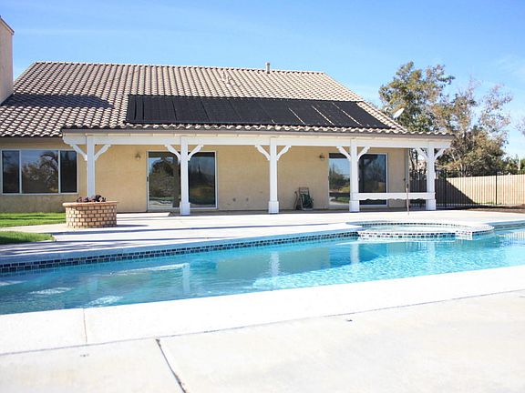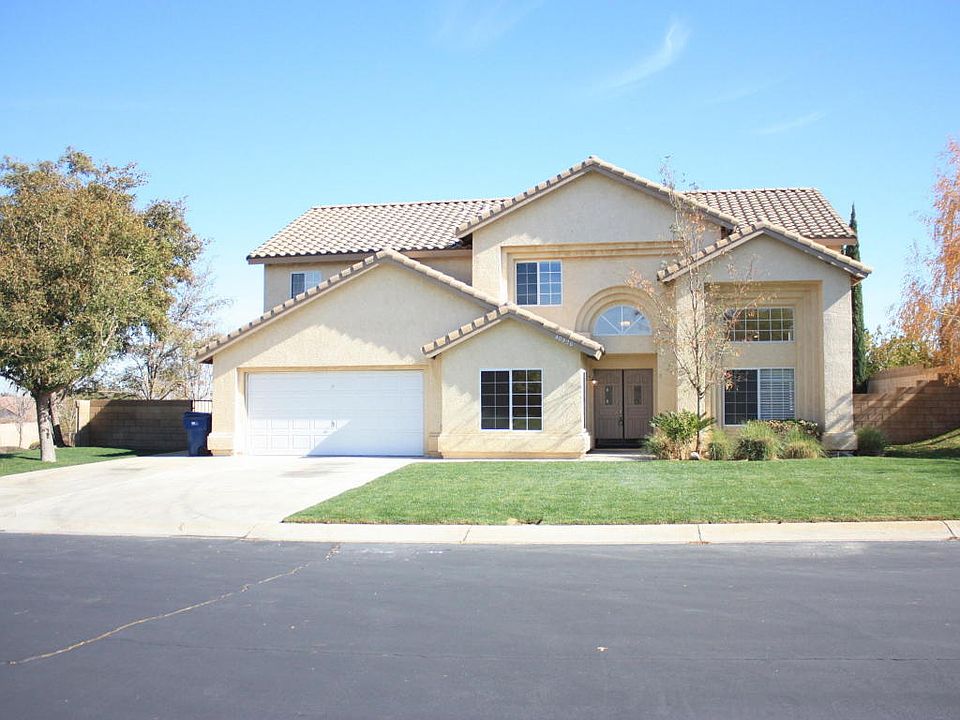 West Palmdale gated community. Home offers upgraded kitchen and baths, new paint and flooring. Master bedroom/bath located downstairs. Best of all is the entertainers rear yard, complete with pool and spa (NEW Plaster AND Tile!) fire pit and extra large patio cover.