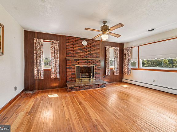 Classic all-brick ranch on a wide lot with tons of usable space and storage. A an extra-wide paved drive leads to an oversized 2-car garage plus a covered carport. Enjoy the welcoming front porch, then step inside to sun-filled rooms with hardwood floors. The living room features a brick fireplace and large picture windows; it flows to a full dining room and an eat-in kitchen with a peninsula/breakfast bar and abundant cabinetry. Comfortable main-level bedrooms, tile hall bath with walk-in shower, and a main-level laundry hook-up that can be easily converted back to the basement. The lower level offers a huge finished rec room—perfect for games or media—plus a wood stove, half bath, utility/laundry sink, storage rooms and workshop space. Between the house and garage is an enclosed breezeway/mudroom with built-in counters/cabinets and a ramp for easy access. A separate three-season room with a brick fireplace adds another great gathering spot and is perfect for entertaining. Outside you’ll find multiple sheds/outbuildings, wood storage, and wide-open yard space with rock outcroppings and pastoral views. Well cared for and ready for your personal updates—bring your hobbies, equipment, and ideas!
