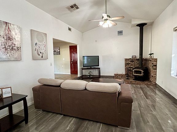 This property is fully furnished and features 4 bedrooms and 2 bathrooms. Each room has a ceiling fan so you can stay cool in addition with 2 AC units, especially in Palmdale summers. The kitchen has basic cooking supplies, dishes and silverware. The rest of the property is fully furnished for general living. Outside features a fire place and a BBQ kitchen and a huge landscape feature in the front that immerses you into nature. There is parking for 4-5 vehicles on the property premises. The main shopping district is roughly 3 miles from the property and there is an aerospace museum close by Lockheed Martin.