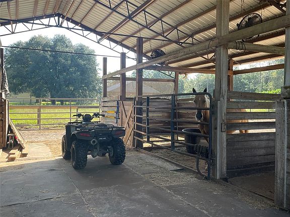 BRING THE HORSES AND THE TOYS! Room for everything on this 2 acre property with 36x36 4 STALL BARN with feed and tack rooms, center aisle. Plus there is a separate WORKSHOP with electric (including 220), water and benches. The 3 bedroom, 2 bath home offers 2020 Roof, Water Heather new in 2021, Water Softener w/ reverse osmosis new in 2021, Well Pump new in 2018. In the Living Room you'll find a wood burning stone fireplace and large sliding doors that open to the 15X33 SCREEN PORCH. The dining area is located at front of open overlooking the front lawn and front pasture. The kitchen has a breakfast bar and the Dinette overlooks the back patio and pastures. This large master bedroom opens via French Doors to a private patio with garden area and easily accesses the barn and paddock areas. Large custom Master Closet, Tiled Walk-In Shower and extended vanity complete the master suite. Off the laundry you can access the 4x24 enclosed storage area (with exterior access too) perfect for storing lawn games, furniture, gardening tools. This property is fenced and cross fenced for horses. Easy access to all things important: Tampa area, Wesley Chapel, Plant City Lakeland and I-4.