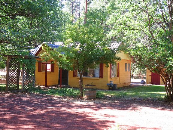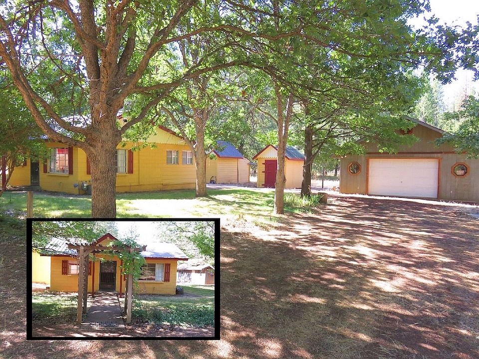 Charming 2 bedroom, 1 bath home nestled under the oaks and pines on 3 level acres. Country kitchen with butcher block bar opening to living area. Wood stove on lava rock hearth, main bedroom has window seat alcove. The home has plenty of room for a cozy setup.PROPERTY HIGHLIGHTS:The natural gas wall furnace is a nice surprise.Outbuildings include a 3 car/boat garage, pump house, root cellar and wood shed.The 960 sf insulated garage has concrete floor, 2 car space in front with roll up door, natural gas heater, laundry room plus hobby room or could be used as a bedroom, office or workshop.The boat garage is at the back with storage area with it's own roll up door.Concrete path from back of home to garage side door.This wonderful setting offers peace and tranquility!Underground sprinklers around home and in circular drive landscaping.Lot's of wildlife including deer.This is a perfect place for a mountain retreat family get a way.Just minutes to the Fall River for world famous trout fishing and recreating.The seller also owns the 5 acre parcel to the west, it's just as beautiful and has a seasonal pond. Buyer will have an option to purchase this property with an accepted offer.
