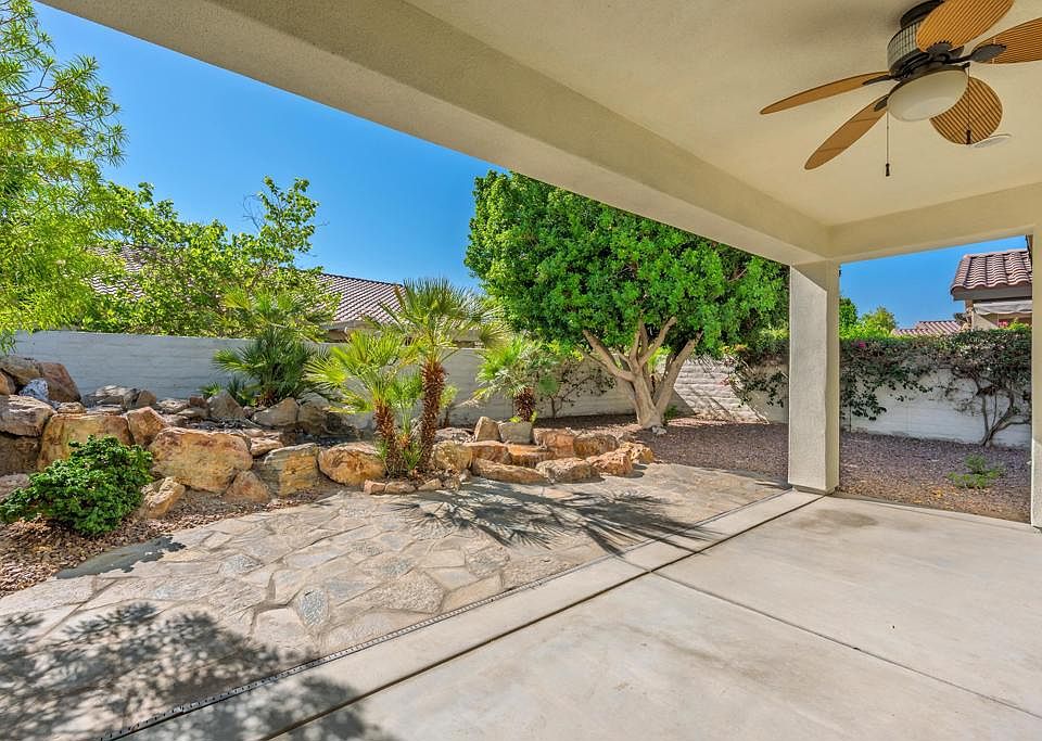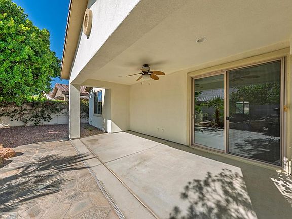 Sun City Shadow Hills - San Ysidro. The impeccably maintained greatroom home has 2 bedrooms, 2 bathrooms, a den and laundry room. The home has a beautiful east facing rear yard with a spacious flagstone patio, lush desert landscaping and tranquil water feature. The interior is freshly painted. Tile and laminate flooring are throughout. Shutters are throughout. The kitchen has new LG appliances (never used) including double wall ovens, under cabinet lighting, slab granite counters and a breakfast bar. Raised panel maple cabinets are in the kitchen and bathrooms. Off the greatroom, double doors open to the den/office. The primary suite has a large walk-in closet. Its bathroom has a stall shower with glass enclosure and dual sinks with upgrade fixtures. Surfaces are cultured marble. A tub/shower is in the guest bathroom. The guest bedroom has a closet with mirrored wardrobe doors. The laundry room has extensive cabinetry and a utilty sink. The 2 car garage has room for ample storage.