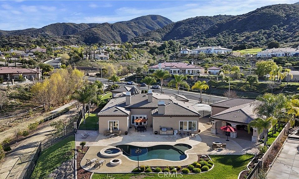 Step outside into your private backyard oasis with breathtaking views. Designed for entertaining, the 1,250 sq. ft. outdoor living area includes surround sound, a built-in BBQ, two fire pits, an outdoor refrigerator, and an ice machine. The resort-style pool and spa, easily managed by the AquaLink system, create the perfect retreat. The beautifully landscaped yard features custom pavers, stamped concrete, extensive outdoor lighting, and 24 mature fruit-bearing trees. Additionally, a wrought iron dog run is conveniently located on the side yard.