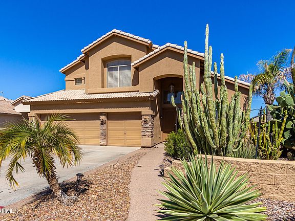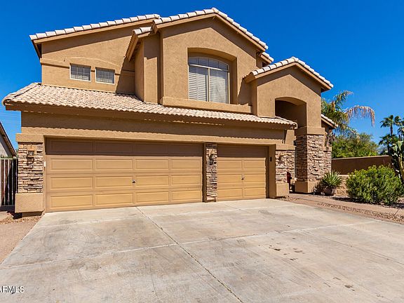 Absolutely gorgeous & impressive N/S facing home w/ 5 bedroom, & 3.5 bathrooms. Low maintenance desert front yard w/ stack stone front elevation. 2 master suites. Main master suite is on the 1st floor w/ separate exit to the back patio. Separate shower-tub, double sinks. Fabulous kitchen features granite countertops & backsplash, glass front cabinets, Eat-in kitchen + breakfast bar. Oversized tile in all the right areas, plantation shutters, central vac, surround sound, security system, & neutral paint colors t/o. 3C-G, corner lot w/ a lot size over 9k. Laundry on the 1st level that includes built-ins. Huge heated play pool, w/ waterfall, big grassy area, & a covered patio that is always shaded. Pre-plumbed gas line for outdoor bbq