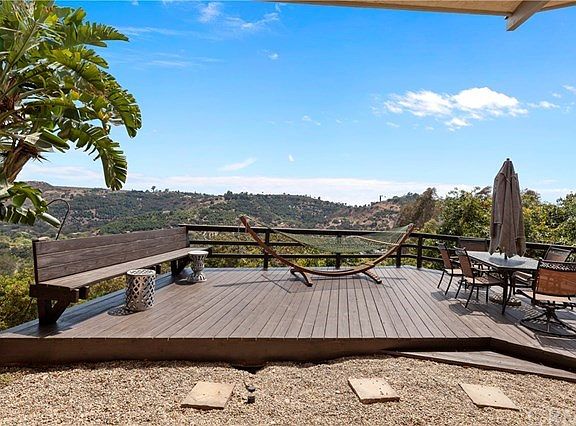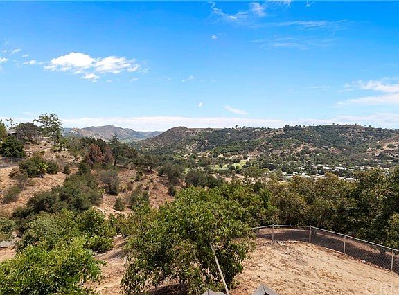This is a rare find: Mid Century Modern custom designed home that sits on top of the hill with panoramic valley and golf course views. Enter through the gates and you are greeted by the pool in the courtyard. You will also see an expanse of new windows allowing loads of natural light into the home. Then you enter the glass front doors into the great room, and are immediately hit with expansive views of the valley below. The great room has a custom fireplace and walls of glass to enjoy the open feeling. One wing houses the master bedroom and 2 additional bedrooms with a jack and jill bath. The master bath shower has a glass wall to allow the feeling of showering in nature. The other wing of the house contains the dining room, kitchen and 4th bedroom/den and 3rd bath. The 4th bedroom has no closet, a fireplace and loads of built-ins. This kitchen has stainless steel appliances and custom cabinetry nearly impossible to find today. The rear of the house is surrounded by viewing decks that overlook 360+ income producing avocado trees and the forever views. The 4+ acres is fenced and cross fenced, and there is even a large 40 x 24 shop/detached garage/workshop with a half bath and compressor. There is even an underground wine cellar/storage room. Owners have installed all new windows and new dual Lennox AC and heat systems. BOM SUBJECT TO CANCELLATION-BUYER DID NOT PERFORM!
