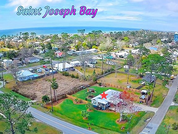 Welcome home to this beautifully designed 2018-built residence, offering 3 bedrooms and 2 bathrooms in a prime location just half a mile from St. Joseph Bay. Nestled on a spacious half-acre corner lot in a golf cart-friendly community, this home seamlessly blends modern comfort with thoughtful functionality. Inside, the open-concept floor plan showcases soaring tray ceilings and luxury vinyl plank flooring throughout. The contemporary kitchen is a dream, offering plenty of space for all your culinary needs, featuring beautiful quartz countertops, stainless steel appliances, a stylish glass backsplash, and under-cabinet lighting. A white refrigerator and a lovely breakfast bar complete the space, making it perfect for entertaining. Designed with accessibility in mind, the home includes 36-inch doorways and wide hallways. The expansive master suite features a stunning acrylic shower, a large walk-in closet with shelving and the master bedroom opens to a screened-in back porch, offering a private retreat. Dual HVAC thermostats allow for personalized climate control across two zones The fully fenced backyard is a true oasis, boasting a charming she-shed, a separate storage shed, and covered parking for a golf cart. With RV power hookups, this property is perfect for adventure seekers, retirees, and families alike. A shallow well is available for outdoor water use, helping to keep utility costs low. Located just minutes from downtown Port St. Joe's boutiques, shops, and restaurants and grocery stores. This home is also a short drive to the white sand beaches of Mexico Beach and Cape San Blas. Don't miss out on this exceptional property—schedule your private tour today!
