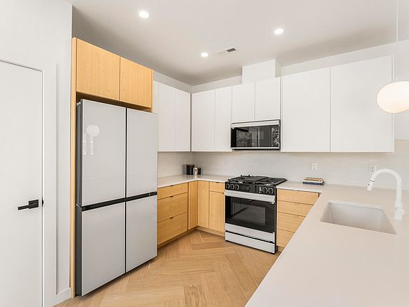 Wide-plank herringbone hardwood floorsPrivate primary balconyGas rangeCustom tileworkSamsung bespoke appliancesSleek modern kitchen