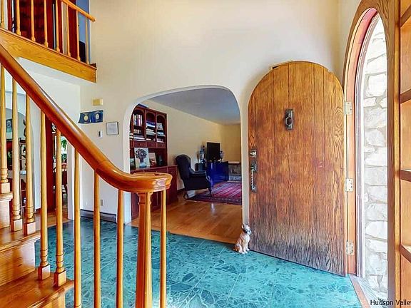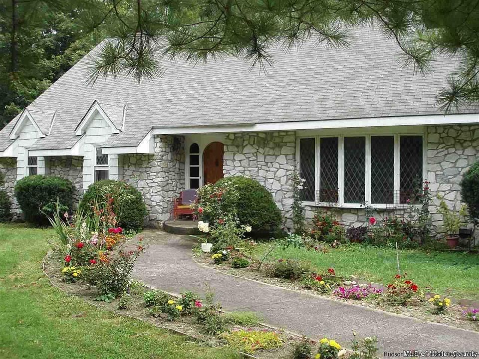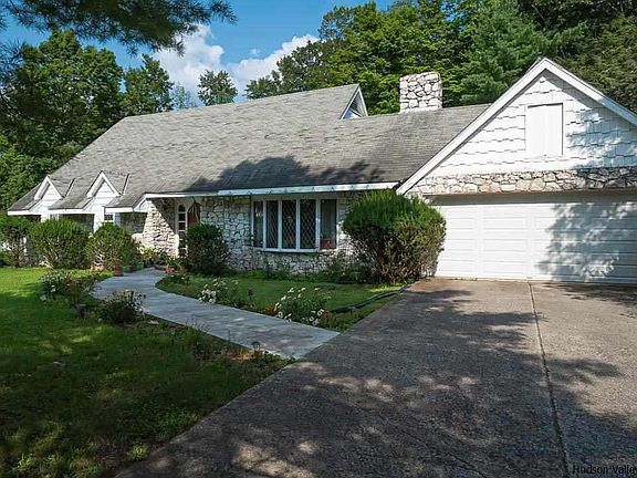 A charming secluded cape on 16+ acres of sunny, large lawns surrounded by forest on Cold Brook Road, one of Woodstock's most beautiful country roads. Generously sized rooms, foyer with marble floor and center hall staircase and marvelous stone fireplace in the living room. Large eat-in kitchen with glass doors to rear patio for lovely outdoor dining or to the firepit for fire flies and roasting marshmallows. Elements of the English style include coffered doors, arched doorways, bay and leaded-like windows and both wide and narrow hardwood floors. The semi-finished full basement has the same 1500 square foot imprint as the first floor and features a beamed ceiling room with a large river-stone fireplace-perfect for pool table/ game room/media room. Access to the basement through the interior of the house as well as thru the side door of the large 2 car garage. Near Woodstock Village and the Ashokan Reservoir, skiing at Bellayre and Hunter Mountains, and all the Catskills have to offer