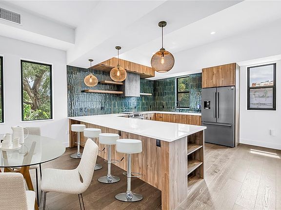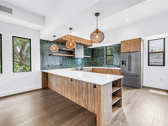One or more photo(s) has been virtually staged. Welcome to this three-story masterpiece that exemplifies design and craftmanship. Located in the vibrant neighborhood of Tampa Heights, this home has great curb appeal with stunning architectural style featuring shale and brick accents and a Redwood entry porch. This home has engineered Oak hardwood flooring throughout. The first floor has a bedroom with designer wallpaper, closet with a built-in and a full bath. This bedroom could also be used as a home office. Both staircases in this home are stunning with open custom steel with Oak treads. With an open concept living, the second floor is the main living area featuring a gourmet kitchen, breakfast nook, half bath, dining and living areas. The kitchen has custom solid wood cabinetry, Quartz counters, stainless steel appliances, pendent lighting, walk-in pantry and gorgeous glass tile backsplash. This living room has a built-in with a wine refrigerator. The third floor of this home has the primary suite, secondary bedroom with a full bath and a laundry closet. The primary suite has a large custom designed walk-in closet. The primary bath has double sinks, water closet and a walk-in shower with dual shower heads. Completing this home is an attached 2-car garage with an electric vehicle charging station. Built to last, this steel framed home is hurricane and termite resistant. Not in a flood zone, this home is located in one of the city’s most dynamic neighborhoods and it is close to sought after destinations such as Riverwalk, Armature Works and Downtown Tampa.