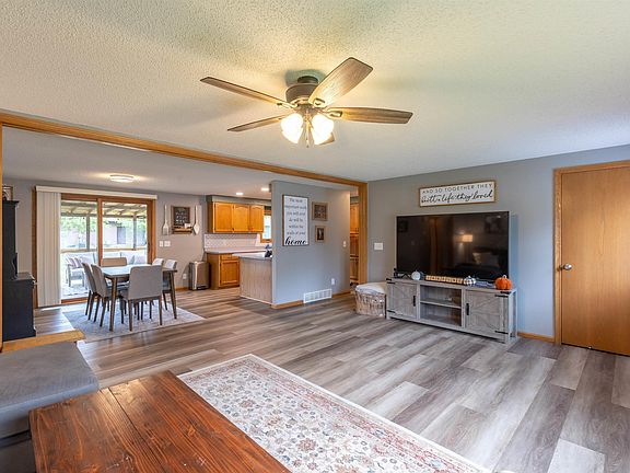 Oversized living spaceOpen conceptGreat windowsOverlooks your backyardDining areaWhite tiled backsplashGray countertop