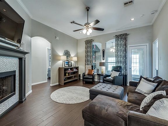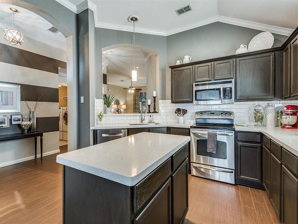 Beautiful, renovated home on a private cul-de-sac with greenbelt & walking paths only a half block away! Spacious, modern kitchen with quartz countertops, subway tile backsplash, & a large single-bowl stainless steel sink & faucet, & stainless steel appliances. Ceramic tile flooring with a hardwood look in entry, kitchen, dining, living, & guest bath. Crown molding. Roof & gutters - less than 2 years old. Updated, corner, gas log fireplace with marble tile surround. Split master suite with separate vanities, separate shower, garden tub & large walk-in closet. Enclosed patio is a bonus room & so versatile! It could be a second living area, office, or exercise room & is not part of tax sf per owner.