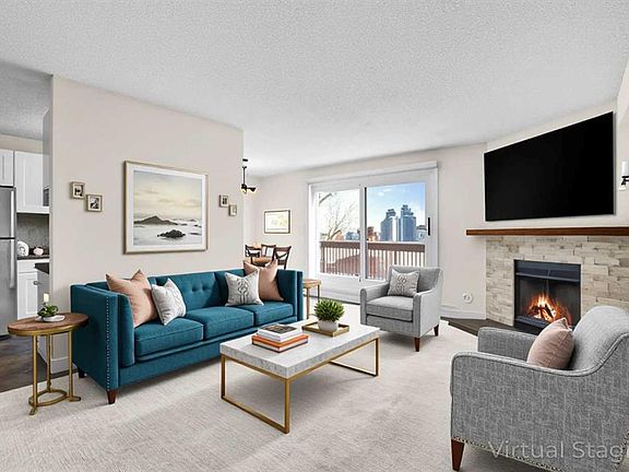 Gorgeous downtown views await from this top-floor condo in very good condition! Bathed in natural light from its south-facing exposure, this home features a sleek white kitchen with stainless steel appliances, slate floors, and large patio doors leading to a sunny 12' balcony. The spacious living room is a showstopper, offering panoramic city views and a charming corner wood-burning fireplace—perfect for cozy evenings. With two generous bedrooms, in-suite laundry, and thoughtful updates throughout, this condo blends comfort and convenience. The location is unbeatable: just a quick stroll to downtown, the trendy Bridgeland cafés and restaurants, and the Bow River pathway system. This well-managed building offers peace of mind with recent upgrades including newer windows, balconies, patio doors, and a new roof (April 2024). Don’t miss this opportunity to enjoy vibrant city living with style, views, and value!