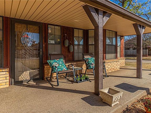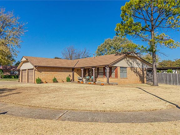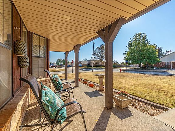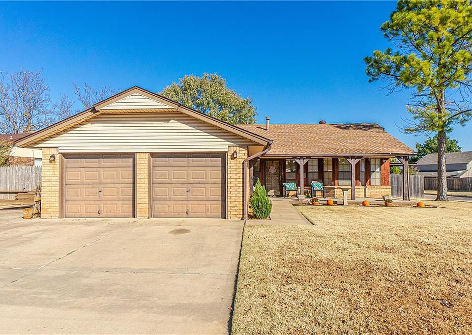 Check out this wonderful home on nearly 1/4 acre CORNER lot in Moore Schools! This unique floor plan boasts 3 beds, 2 bath, an office nook and a back addition that can be used as a perfect sunroom or playroom. The large living area has a beautiful wood burning brick fireplace with built in bookshelves and cabinetry. The large master bedroom features a full bath and walk in closet. The covered front porch has a large sitting area perfect for relaxing evenings. You'll enjoy the large backyard that includes a covered patio and nice storage building. A STORM SHELTER is included in the garage.