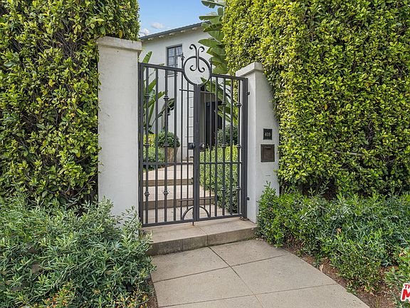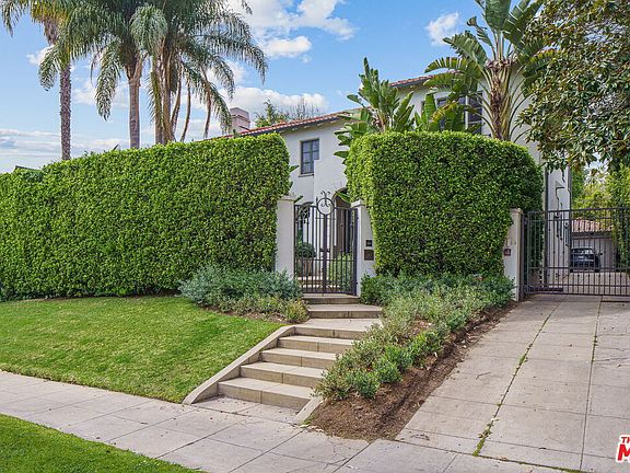 Secluded behind lush greenery and a romantic gate awaits this stunning 1920s Spanish dream. Situated in Hancock Park, the home is located just moments from the Wilshire Country Club, local shops, restaurants and more. An inviting living room has beautiful crown molding details, oversized windows, and brick fireplace. Light and bright, the kitchen features a butcher-block center island, farmhouse sink, top-of-the-line appliances, and elegant white cabinetry. The luxurious and spacious primary includes grand windows for an abundance of natural light, a walk-in closet with built-ins, and a marble bath with sleek wood accents, glass shower, soaker tub, and dual-sink vanity. Enjoy a sense of permanent summer vacation in a tropical locale from the resort-like yard, enveloped by mature palms with a sparkling pool and spa, fire pit, and pergola. Additional amenities include guest rooms, bonus room/den for playroom or office, detached guest house, a formal dining room, and more. This Hancock Park gem is truly a rare offering.
