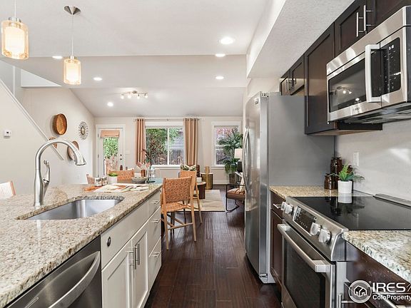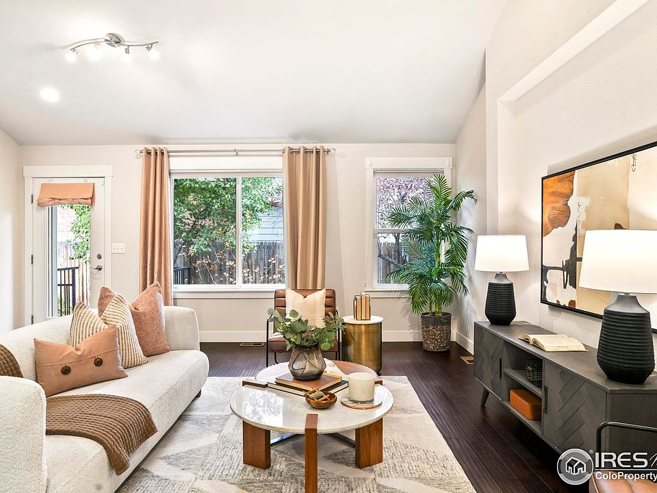 Urban sophistication meets small-town charm in this beautifully appointed brownstone-style townhome in the heart of Old Town Longmont. Just two blocks from Main Street and moments from local shops, beloved eateries, parks and breweries, this residence blends effortless convenience with elevated design. Hardwood floors, lofty ceilings and expansive windows fill the main level with natural light, complementing a spacious living area and a gourmet kitchen featuring granite countertops, stainless steel appliances and a center island. The generous primary suite impresses with a walk-in closet, en-suite bath and a private outdoor balcony, while additional bedrooms offer versatility for guests or a home office. A finished lower level expands the living space, connecting to private outdoor areas ideal for relaxation or entertaining. With 2 reserved off-street parking spots and a move-in ready interior, this refined retreat delivers timeless brownstone appeal in one of Longmont's most vibrant neighborhoods.