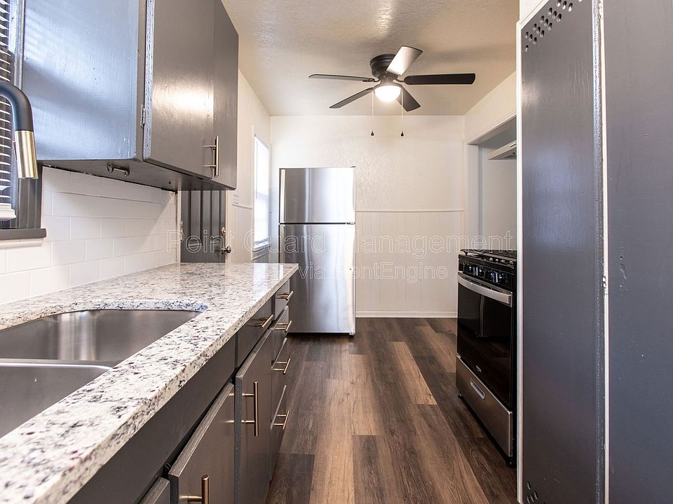 Granite countertopsNew appliancesWood-like flooringCeiling fan