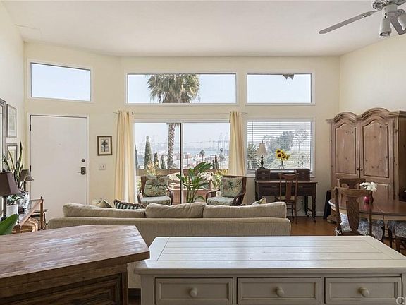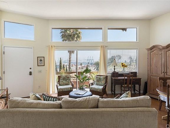 High on hill, on a stately corner lot, you will find this lovely townhome with sweeping views of the bustling Port of Los Angeles and beyond. An intriguing vista awaits from the cruise ship port, Fanfare Fountains, Knoll Hill, Vincent Thomas Bridge, the docks, ocean, all the way out to majestic, snow-capped mountains. Step through the front door to find the open concept living space on the first floor, complete with high ceiling and a wall of windows bringing in the bright view. This spacious and sunny level features the family room open to the view deck, eating area, well-equipped kitchen with breakfast bar, storage under the stairs, plus direct access to the attached 2 car garage. Ascend the staircase to the 2 bedroom suites together upstairs, conveniently adjacent to the laundry room and plentiful linen closets. Both bedrooms offer their own en suite full bathrooms, abundant closet space and balconies for that inviting, indoor-outdoor feel. The larger bedroom features a vaulted ceiling, ceiling fan, dual sinks in the vanity area as well as a luxurious jetted spa bathtub boasting yet another glorious view. This special home in a small HOA is now ready for you to move right in and enjoy. Delight in the varied views that the harbor has to offer and the excitement of the San Pedro waterfront redevelopment already underway!