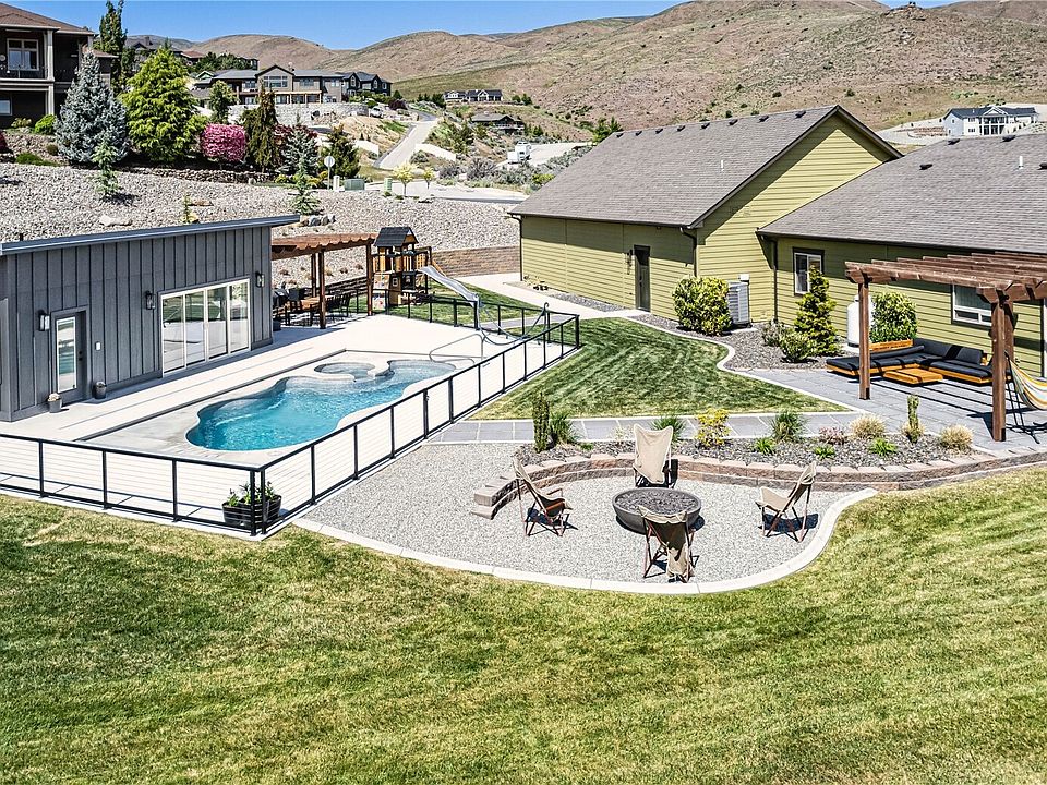 This stunning rambler captures sweeping views of the river and valley with essential living on the main floor, plus a versatile bonus room upstairs. Well-placed windows frame the scenery while the open floor plan flows easily between indoor and outdoor spaces—ideal for entertaining or quiet moments. Step outside to a heated in-ground pool, hot tub with automatic cover, outdoor shower, and lounge areas. The pool house includes a full bath, kitchenette, and 450-sf living area. A heated, oversized 3-car garage offers ample space, and the driveway has RV parking and extra spots. Covered patios, sunny lounges, and a firepit invite you to relax and enjoy the view. This property blends luxury, comfort, and unforgettable surroundings.