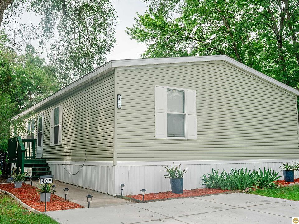 With almost 1500 square foot, 4-bedrooms, and 2-bathrooms, this home is sure to give you and your family the space you need. This double wide home is nestled on a large corner lot with multiple mature shade trees and includes 4 off-street parking spots. Upon arriving, you will immediately notice the beautiful landscaping, flowers, and plants. As you step inside, you will be greeted by the large open floor plan in this meticulously kept home. The owners have upgraded this home in many ways including a new main water line and driveway in March of '25. Digital and programmable thermostat, video cameras in the front and back, both doors have digital and biometric locks, and more. The HVAC and AC have been tested and serviced every year. The decks have both been treated and resealed. Both entrance doors were reframed, and the interior has been recently repainted as well. You won't find a mobile home as large and as well-kept as this one. Don't miss your chance for comfortable living!