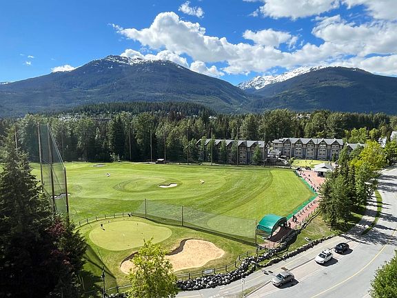 Corner condoRefined mountain resort livingTwo balconiesWhistler golf driving rangeOpen kitchenCozy fireplace