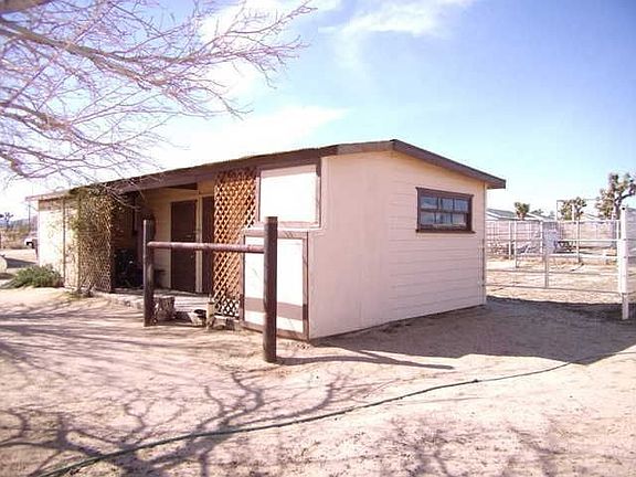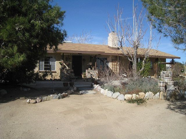 4.41 acre ranch has 2 houses with off the grid guest trailer with covered deck. The main home is 1645 sq. ft.3 bedroom two bath The guest house has an open floor plan living room, kitchen, dining 1 bedroom and 1 bath 1200 sq. ft. Fresh paint inside and out with a newly remodeled bathroom. Main house has a new roof. This property is perfect for a large family or Airbnb investment. The landscaping has beautifully appointed desert scape, as well as roses, mature trees, pine, trees of heaven, fruit and fruitless mulberry, and countless perennials surrounded by spacious patios, walkways, wishing well, pond and birdbaths. This horse property has the following amenities to include a stables with hay barn, 2 stalls, 2 tack rooms, chicken coop, storage shed, and 4 corrals built by cowboys. Views include Bartlett Mountains, Joshua Tree National Park, Joshua Trees and Yuccas abound.