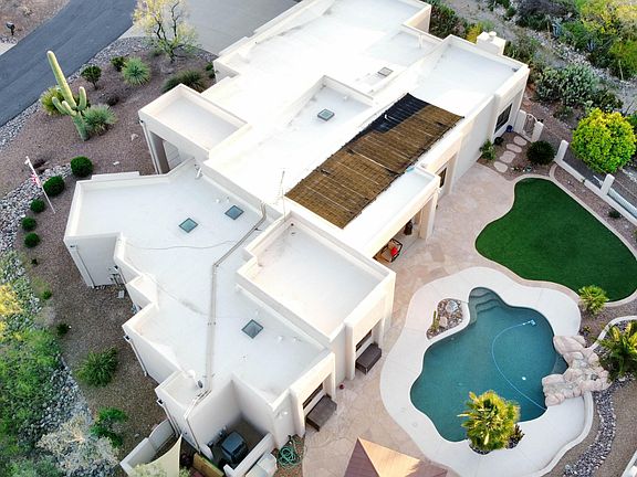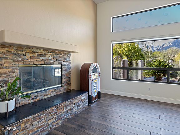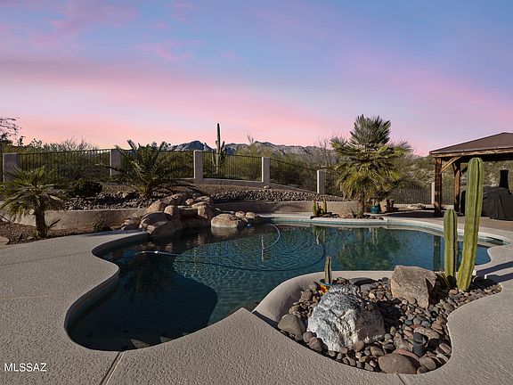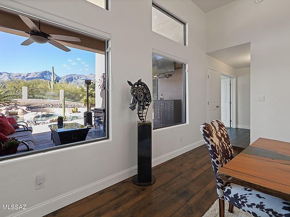 Range pricing:1,000,000.- 1,100,000 Luxurious Contemporary Retreat in the beautiful Catalina Foothills: Nestled atop a serene cul-de-sac, this stunning hillside residence offers true Arizona living with unparalleled mountain vistas. Crafted for both elegance and functionality, the interior boasts a seamless layout allowing for abundant natural light and captivating views of the Catalina Mountains from the family room, kitchen, dining area, master suite, and bath. Revel in the ambiance of lofty 10-foot ceilings, gleaming ceramic wood floors, and plush carpeting in all the bedrooms. Recently refreshed with a coat of paint, the residence exudes a sense of timeless appeal. The heart of the home, a gourmet kitchen, features granite countertops, top-of-the-line stainless steel appliances, an expansive island,and a breakfast bar. An inviting family room offers a cozy fireplace and panoramic mountain views, while the master suite pampers you with an updated bathroom showcasing double vanities, honed granite countertops, and a luxurious custom shower with river rock flooring and dual shower heads. Additionally, the oversized custom master closet ensures ample storage. Accommodations include three additional bedrooms, one featuring a queen-sized Murphy bed, and two full baths, all adorned with wooden shutters. Outdoors, the backyard oasis beckons with a solar and gas-heated Pebble Tec pool, a soothing waterfall, and a charming ramadaall set against a backdrop of breathtaking Finger Rock and Catalina Mountain vistas. Completing this exceptional property is a three-car divided garage with a separate temperature-moderated storage room. Experience the epitome of foothills living in this meticulously landscaped sanctuary.