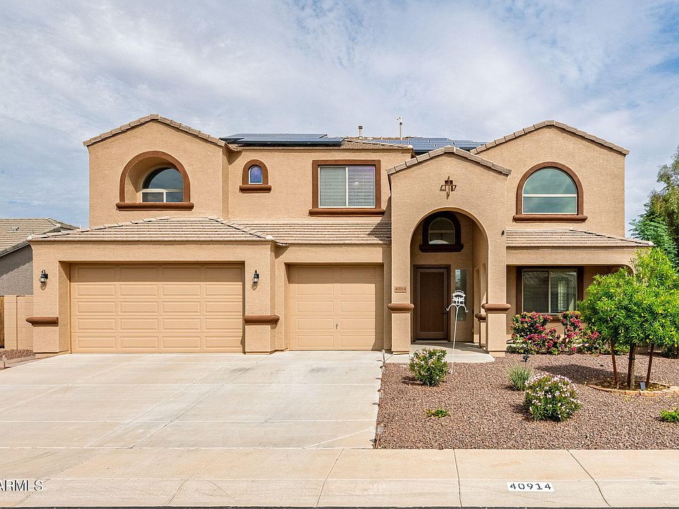 Here is your chance to own the BIGGEST house in Maricopa on the market with 4593sf! Enjoy practically free electricity with this beautiful home featuring fully paid-off solar panels, no lease, no payments, just monthly savings. This spacious 5 bedroom, 3.5 bath property has been freshly painted and updated with new flooring throughout, offering a pristine, move-in-ready feel from the moment you walk in. The home features a formal living room, formal dining area, and a large eat-in kitchen complete with upgraded cabinetry and stainless steel appliances. A generous family room w soaring 20 foot ceiling provides plenty of space for relaxing or entertaining, & there is an office and powder room on main floor. Upstairs, the primary suite includes a cozy retreat, perfect for reading or unwinding, along with an en-suite bath featuring upgraded fixtures and finishes. All bedrooms include ceiling fans and blinds. Step outside to a private backyard designed for low-maintenance living, featuring pavered patio, artificial turf, citrus trees and immaculate landscaping. A three car garage with service door and double gate ensure plenty of room for your vehicles and toys. Even pets can enjoy the outdoors protected by the custom kennel with access from the house. Homestead offers numerous playgrounds, sport courts & a lake.