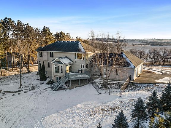 Discover a truly one of a kind custom built estate offering over 5,000 finished square feet nestled on 80 breathtaking acres. Proudly owned by the original owner, this exceptional property blends luxury, space, and natural beauty in a setting rarely found. A grand entrance welcomes you into the stunning living room featuring soaring ceilings and a dramatic indoor waterfall, creating an unforgettable first impression. The home flows effortlessly into the gourmet kitchen complete with granite countertops, stainless steel appliances, and a warming drawer, perfect for entertaining. An inviting eat in area with expansive windows showcases gorgeous panoramic country views. The main floor also includes a formal dining room, family room, laundry room, and two bedrooms, offering both comfort and functionality. Upstairs, retreat to the grand primary suite featuring two large walk in closets and an oversized spa like bathroom with soaking tub, tile shower, and private sauna. A versatile bonus space provides the perfect option for a home office, sitting area, or additional living space. The finished lower level offers two bonus rooms that could easily serve as additional bedrooms, a full bathroom, abundant storage, and more flexible living space. An attached, heated 3 car garage adds convenience, while the oversized detached 6 car garage offers incredible potential, featuring a one bedroom apartment with living room, kitchen, full bath, and laundry. Ideal for multi-generational living, guests, or an in home business. The land itself is equally impressive with a beautiful mix of tillable acreage providing income, wooded areas for recreation and hunting, and a creek winding through the property. Zoned Agricultural and serviced by natural gas. This remarkable property is a true treasure, offering privacy, versatility, and endless opportunity. Move quickly, opportunities like this are rare.