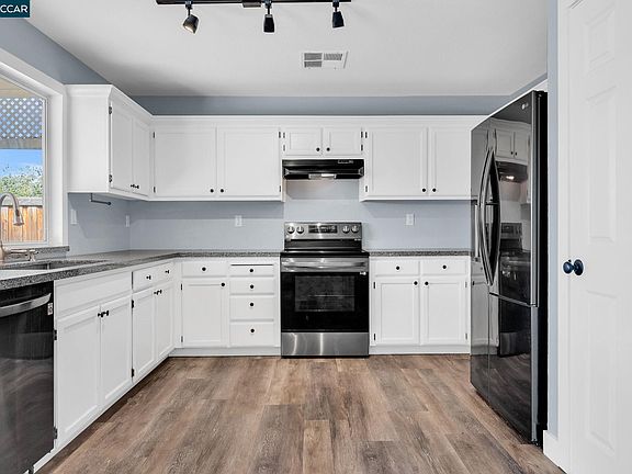Quiet street with no rear neighbors! Vaulted ceilings and abundant natural light greet you as you enter this beautifully updated 2-story, 4-bedroom, 2.5-bath home. Every detail has been refreshed, including all-new exterior and interior paint, plush carpet, luxury vinyl plank flooring, modern light fixtures, outlets and switches, and sleek recessed lighting. The kitchen shines with a brand-new oven featuring a built-in air fryer—perfect for easy weeknight dinners or hosting friends. Both bathrooms have been stylishly remodeled with fresh finishes, new vanities, and updated fixtures. The spacious primary suite boasts vaulted ceilings and a breathtaking view of Mount Diablo, creating the perfect spot to unwind. Enjoy cozy evenings by the wood-burning fireplace in the family room or step through French doors to the pergola-covered patio, ideal for outdoor dining and gatherings. Large backyard offers room to play, garden, or entertain, large side yard access for an RV, trailer, jet skis, or boat. Located in a peaceful, well-kept community close to scenic waterways, marinas, parks, and trails, this home offers the perfect balance of relaxation and recreation. Move-in ready and designed for today’s lifestyle—come experience it for yourself!